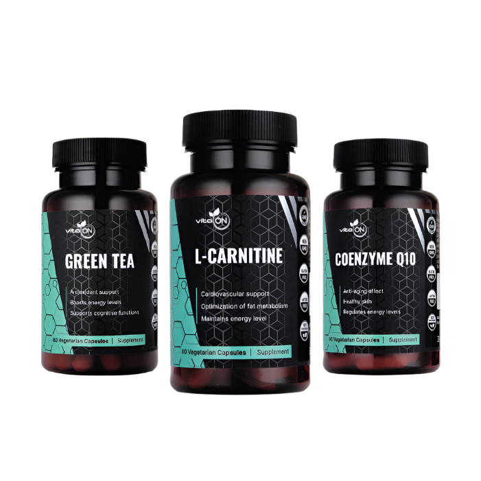 Kombinace koenzymu Q10 se zeleným čajem a L-karnitinem zlepšuje energetické hladiny v těle a podporuje regeneraci po intenzivní fyzické aktivitě.