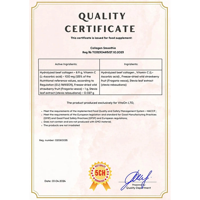 Collagen Smoothie se skládá z hovězího (hovězího) kolagenu extrahovaného ze šlach, kloubů a kostí a dalších vedlejších produktů. Ve složení přípravku převažuje kolagen typu I a typu III.