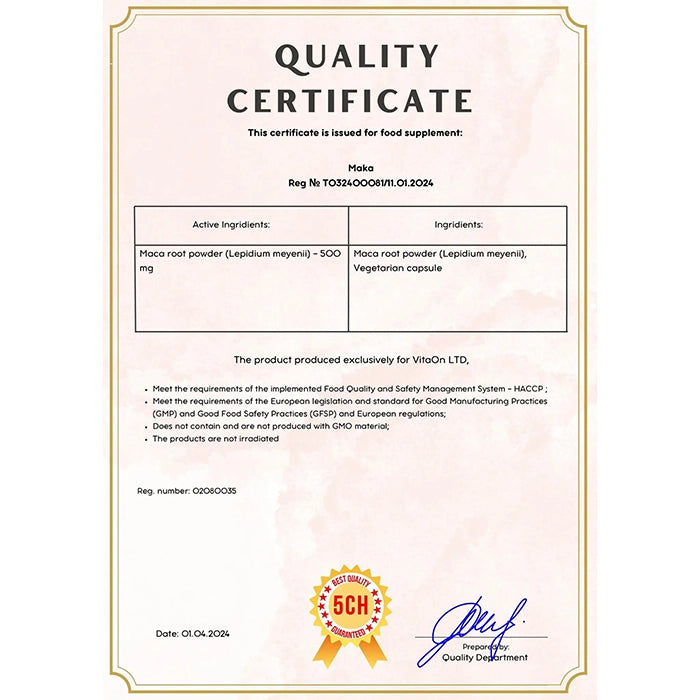 Premium Formule od VitaOn vám poskytuje 1000 mg vysoce kvalitního extraktu z kořene rostliny Kořen Maca, známé také jako Peruánský žen-šen.