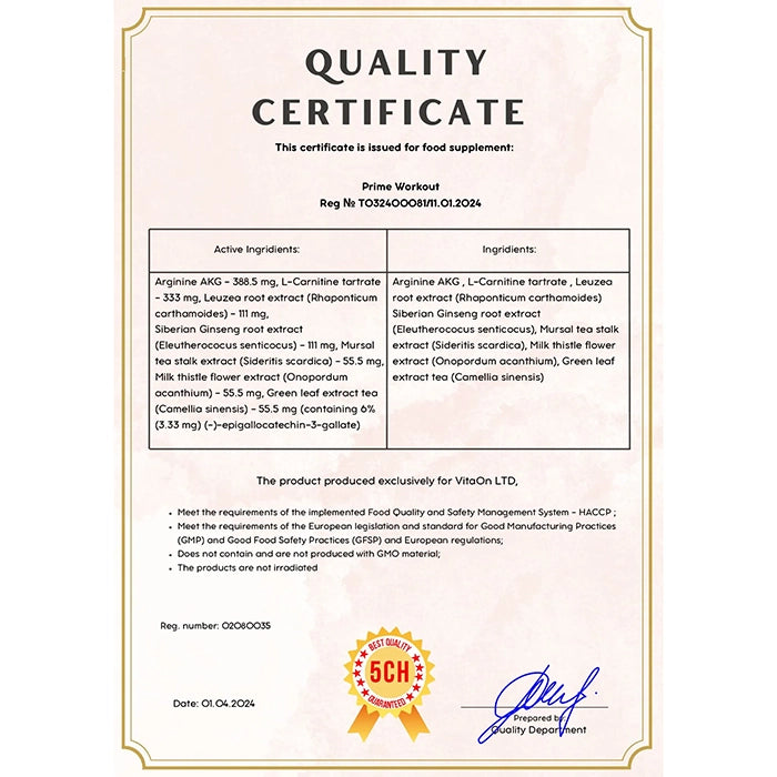 Na rozdíl od jiných předtréninkových produktů, naše doplněk obsahuje stimulanty (kofein) výhradně přírodního původu (obsahuje se v zeleném čaji) v dávkách, které jsou naprosto bezpečné. Kromě toho přítomnost adaptogenních bylin a přírodních složek činí „Prime Workout“ zdravým produktem, vhodným jak pro sportovce, tak pro osoby s dynamickým každodenním životem.