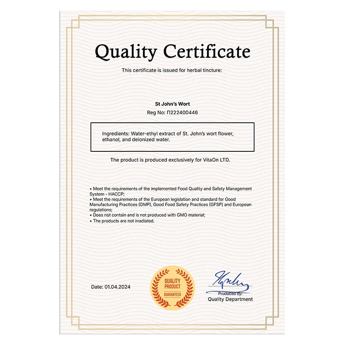 Při výrobě tinktury „Třezalka tečkovaná“ od VitaOn byly použity pouze vysoce kvalitní stonky rostliny, sbírané v nejlepším období pro to, z ekologicky čistých oblastí. Tímto způsobem zajišťujeme maximální účinnost nabízeného produktu.