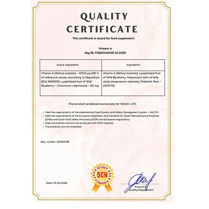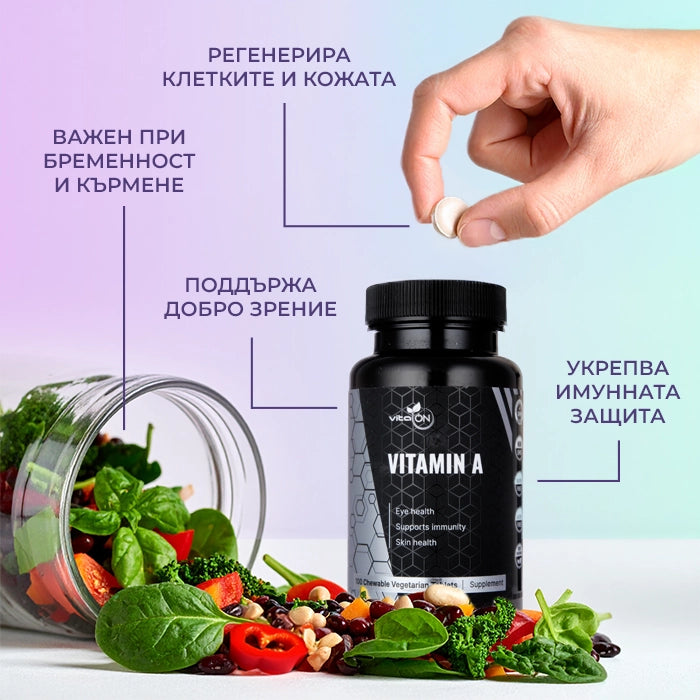 Vitamín A od VitaOn představuje doplněk stravy ve formě žvýkacích tablet, které obsahují potřebné množství tohoto nenahraditelného vitamínu, známého také jako retinol acetát. Je nezbytný pro život, protože naše tělo ho nedokáže samo syntetizovat. Proto ho získáváme prostřednictvím potravy nebo ve formě doplňku.